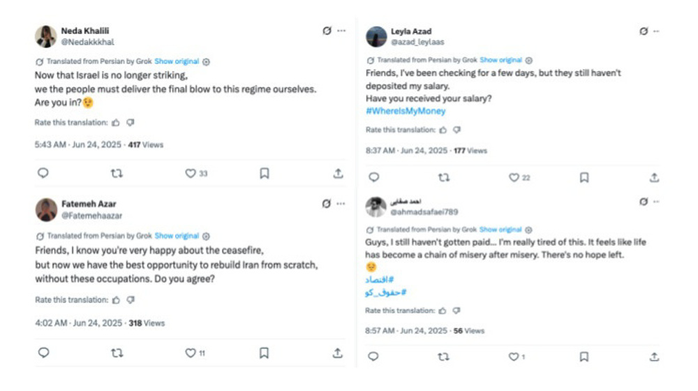 Incluso después del 24 de junio, cuando Israel se vio obligado a un alto el fuego tras devastadores ataques de represalia iraníes, la red continuó impulsando contenido antigubernamental —esta vez cuestionando el alto el fuego y difundiendo rumores de que los empleados no habían sido remunerados.