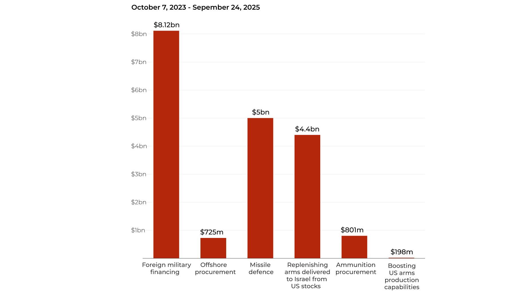 Según datos del proyecto Costo of War, publicados por Al Jazeera Labs, entre el 7 de octubre de 2023 y el 24 de septiembre de 2025, Estados Unidos ha entregado al menos 21.7 mil millones de dólares en asistencia militar a Israel.
