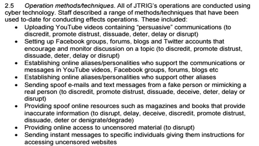 Según los documentados filtrados, el ente encargado de la misión, llamado Grupo de Investigación de Inteligencia de Amenaza Común (JTRIG, en inglés) tenía como objetivo instrumentalizar varios métodos en las redes sociales para emprender campañas de propaganda contra el Gobierno persa.