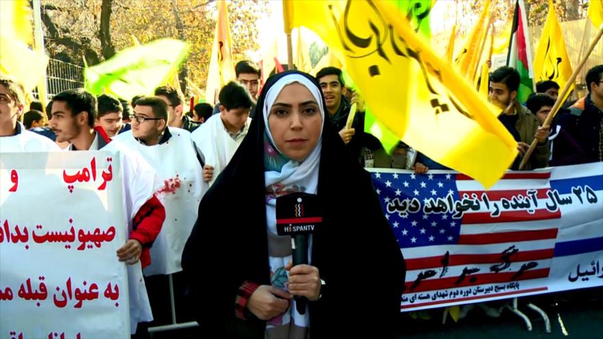 Estos estudiantes, con su congregación y el clamor de sus lemas, muestran su indignación por la medida antipalestina de Trump, que consideran una seria amenaza a la paz en el oeste de Asia.