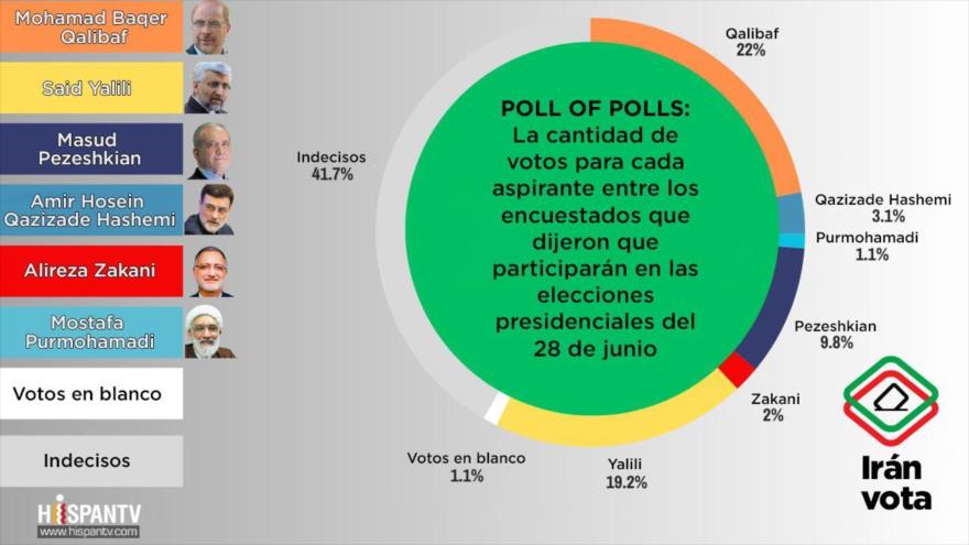 La encuesta “Poll of Polls” publicada este jueves, una encuesta de campo preelectoral basada en entrevistas realizada por agencias independientes, muestra que el actual presidente del Parlamento, Mohamad Baqer Qalibaf, tiene una ventaja sobre otros aspirantes.