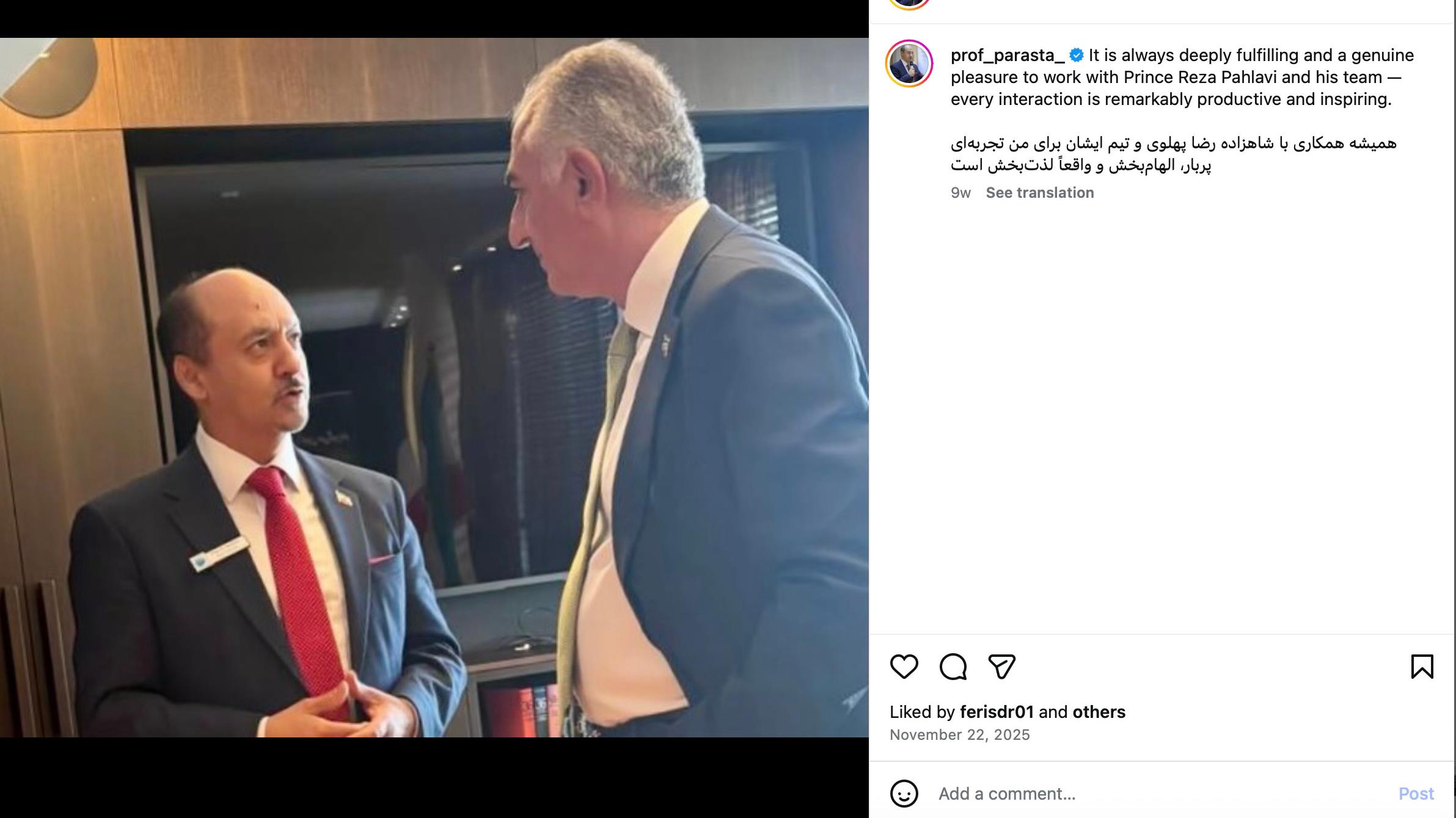 De manera similar, Parasta ha promovido una línea semejante en sus cuentas de redes sociales. Su cuenta de Instagram incluye innumerables fotos de él junto a Pahlavi, con frases como: “Siempre es profundamente gratificante y un verdadero placer trabajar con el príncipe Reza Pahlavi y su equipo: cada interacción resulta extraordinariamente productiva e inspiradora”.
