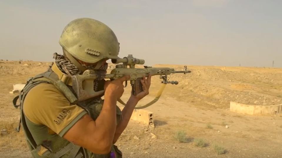 En la grabación también se ve un helicóptero de ataque y transporte de tropas Mil Mi-35 de las fuerzas aeroespaciales rusas y a un francotirador del Ejército de Tierra de Rusia, equipado con un rifle de francotirador Dragunov (SVD), vigilando una zona en las afueras de Deir Ezzor, ciudad que hasta hace unas semanas estuvo sitiada por los terroristas de EIIL (Daesh, en árabe).