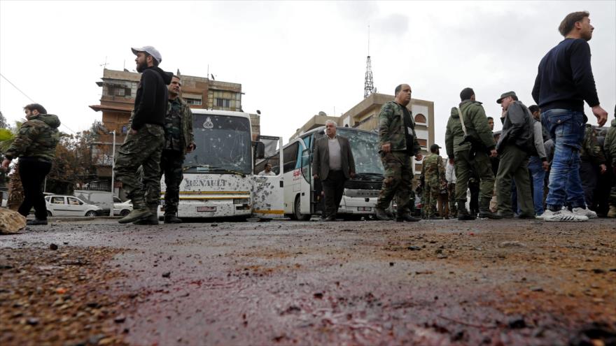 En el primer atentado, una bomba explotó al paso de un autobús cerca del cementerio Bab al-Saqir, en Bab Mousallah, y en el segundo, un suicida detonó en la misma área las cargas explosivas que llevaba adosadas al cuerpo, tal y como afirma el director del OSDH.