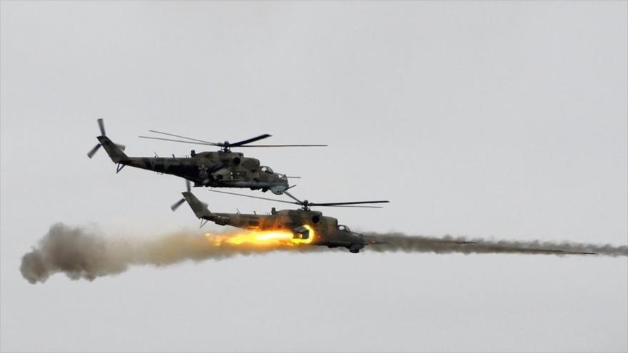 En las imágenes, divulgadas este miércoles, se ven bombarderos tácticos de la Fuerza Aérea Siria y helicópteros de las Fuerzas Aeroespaciales de Rusia lanzando fuertes ataques contra posiciones de terroristas en el pueblo de Al-Sujnah, en la provincia central de Homs.