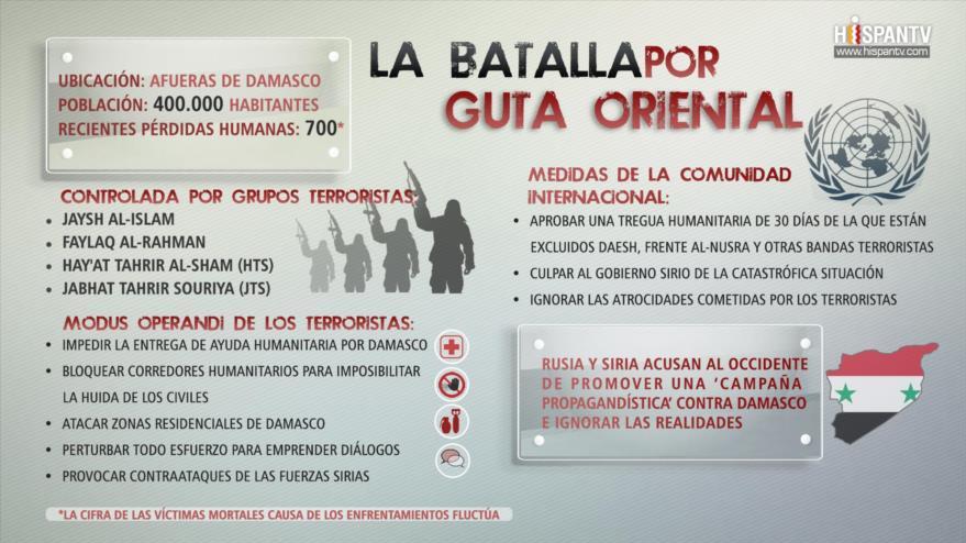 Después de más de tres semanas, las fuerzas sirias y sus aliados se han hecho con el control del 70 % de la región de Guta Oriental. Ante la crisis humanitaria, creada por los grupos armados en esta región, el Ejército sirio anunció una tregua de 24 horas para evacuar a los civiles.