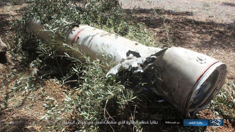 Mediante una nota emitida por su agencia de noticias, Amaq, la banda ultrarradical ha difundido varias fotografías en las que se ven supuestos restos del avión de combate sirio abatido ayer martes por misiles Patriot del régimen israelí.