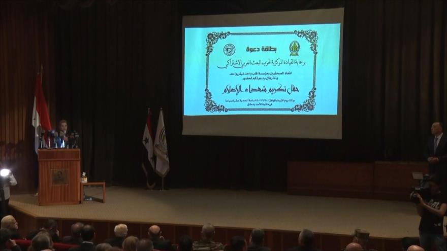La Federación de Periodistas de Siria organizó, este miércoles, una ceremonia para rendir homenaje a los periodistas que murieron en los campos de batalla, mientras informaban sobre los años de guerra en el país árabe. Los funcionarios que asistieron el evento elogiaron los sacrificios de esos periodistas, entre los que se encontraban reporteros, camarógrafos y empleados de los medios de comunicación.