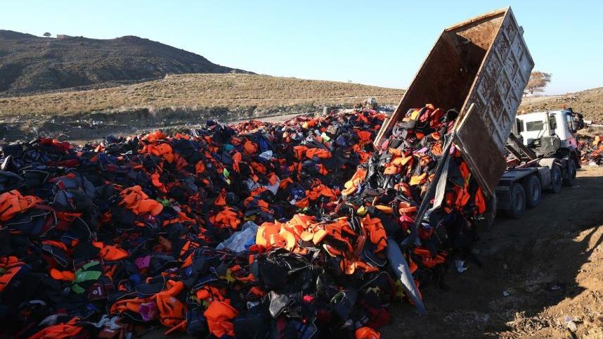 Un centenar de voluntarios utilizaron los chalecos recogidos en el basurero de la aldea de Molyvos, donde se acumulan miles de ellos abandonados por las 500.000 personas que han llegado a esta isla, explicó la ONG.