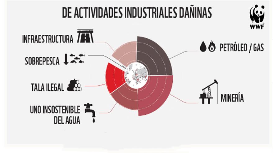 "Entre otras actividades nefastas, a menudo obra de multinacionales y sus filiales, se puede citar la exploración y la extracción petrolera o de gas, la minería, la explotación forestal ilegal, la creación de grandes infraestructuras, la pesca abusiva y la sobreexplotación de recursos acuíferos", resume la ONG.