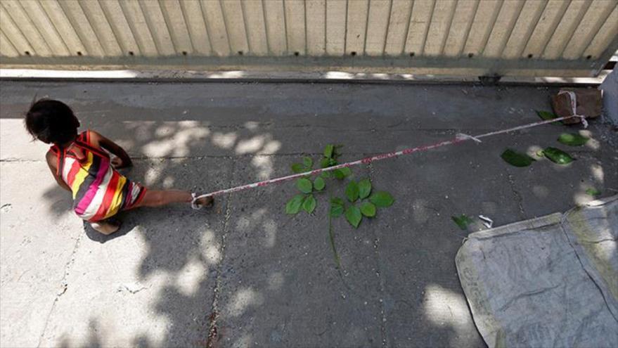 Según informa la agencia de noticias británica Reuters, la niña, fijada con una cinta perimetral, descalza y llena de polvo, pasa 9 horas diarias a una temperatura de hasta 40 grados.
