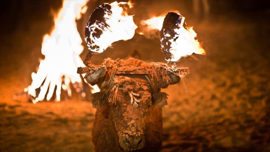 Un toro es atado a un madero, en la plaza mayor medinense a las 23.30 horas de la noche, y los mozos del pueblo le embadurnan de arcilla, antes de colocarle la gamella (arco que se forma en cada extremo del yugo de los animales de tiro) con dos grandes bolas de pez que mantendrán el fuego durante minutos, con el astado dando vueltas por el ágora.