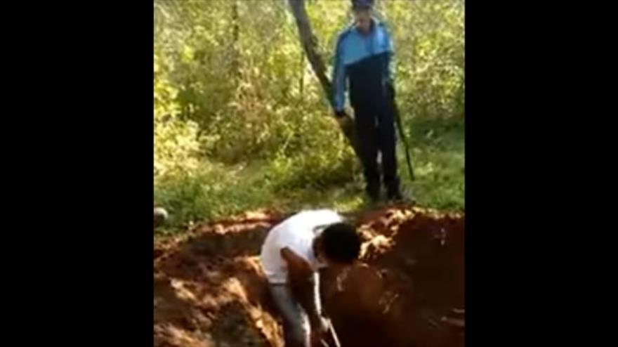 En un vídeo difundido el jueves se ve cómo mientras uno de los jóvenes fuma y cava a la vez, varios hombres armados se encuentran al lado vigilándolos.