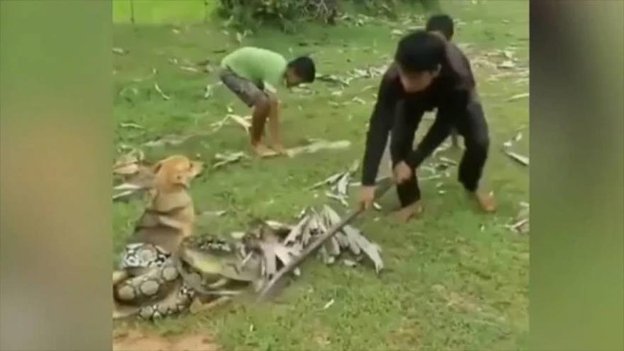 Como se observa en las imágenes, los niños recurren a piedras y palos e incluso intentan separar a la serpiente del can con sus propias manos.