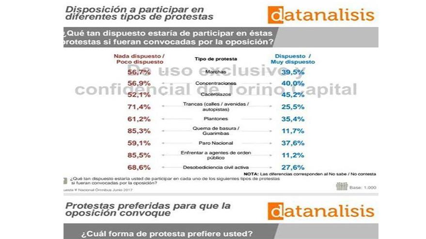 El muestreo, filtrado por la periodista Érika Ortega Sanoja, registra también que un eventual paro nacional convocado por la alianza opositora Mesa de la Unidad Democrática (MUD) sólo sería apoyado por el 37 de la población, mientras que un proceso de desobediencia activa sería acompañado por el 27 % de los venezolanos.