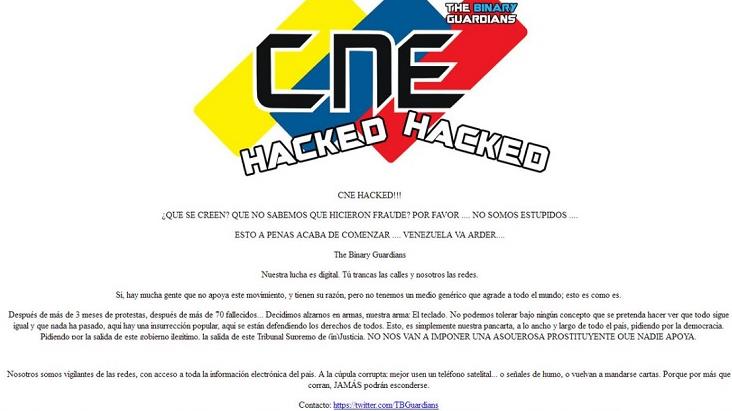 En la página de inicio del sitio aparecieron en la madrugada de este lunes la palabra ‘hacked’ y la cuenta en Twitter del grupo que habría efectuado la piratería informática, ‘The Binary Guardians’.
