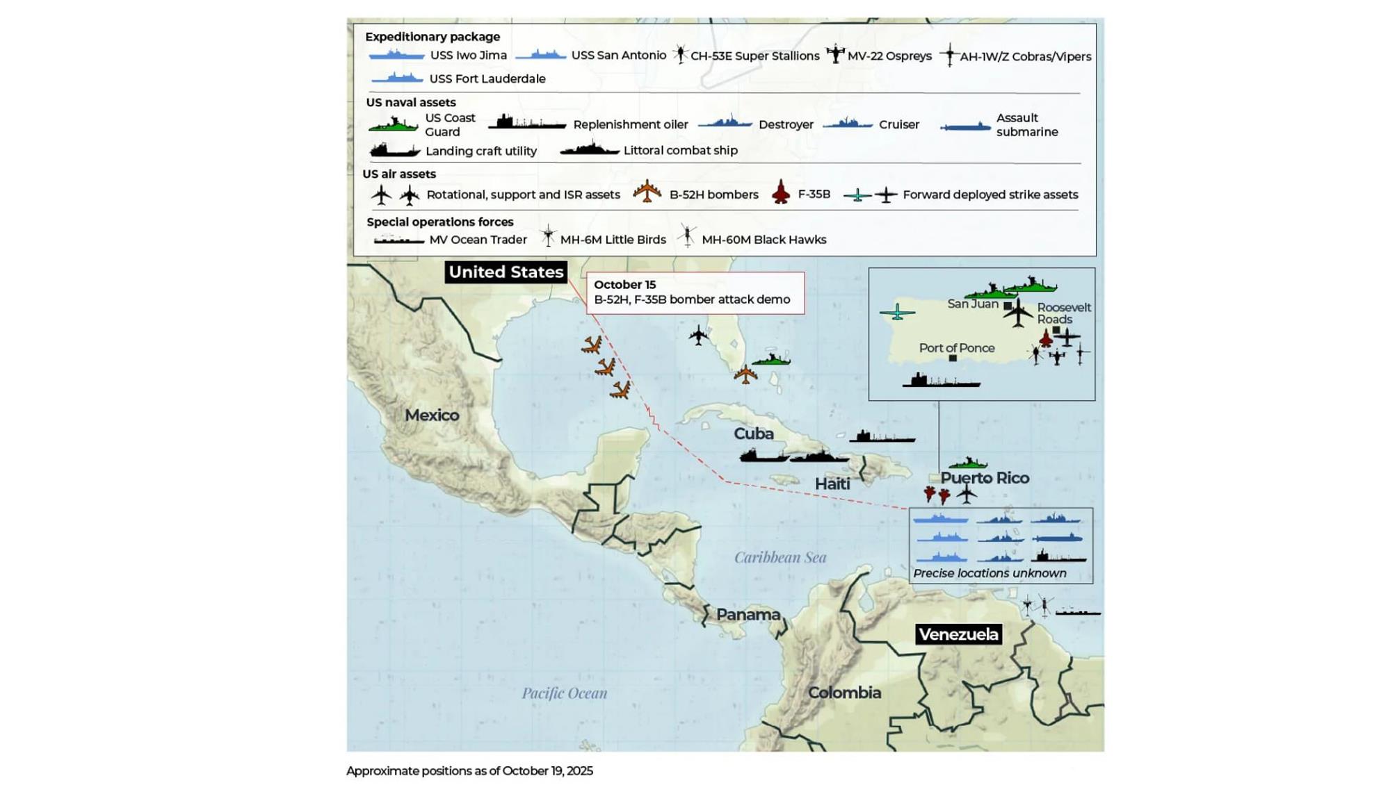 Según comunicados del Pentágono, desde agosto, Estados Unidos ha desplegado una flotilla conformada por buques, aviones de combate y un submarino a propulsión nuclear, bajo la directiva oficial de contrarrestar el narcotráfico. A este contingente ahora se sumará el portaaviones USS Gerald R. Ford, el más grande de la flota estadounidense, con capacidad para operar 90 aviones y helicópteros de ataque, según informó el portavoz del Pentágono, Sean Parnell.