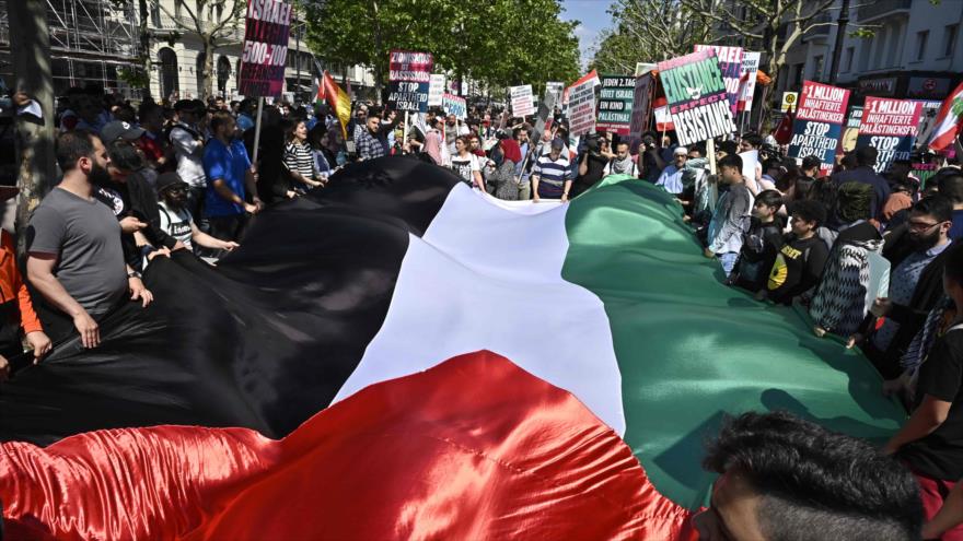 La masiva marcha, convocada por los grupos islámicos y propalestinos alemanes, ha congregado este sábado a distintos colectivos defensores de los derechos del pueblo palestino, incluidos judíos ultraortodoxos contrarios al régimen sionista de Israel.